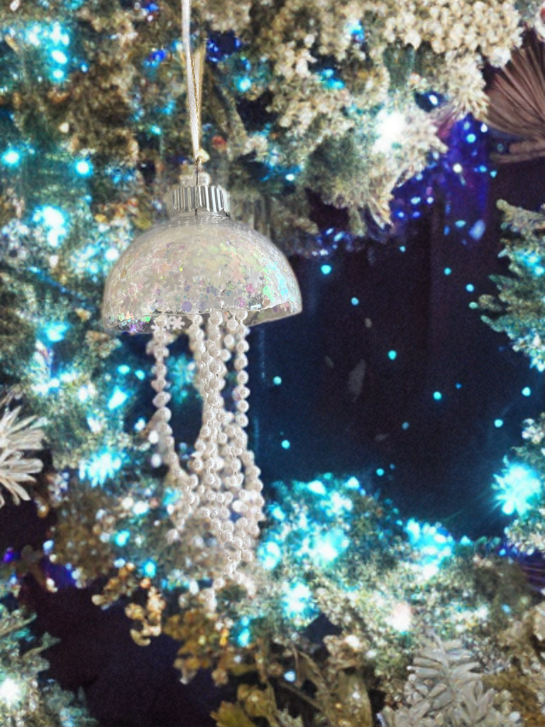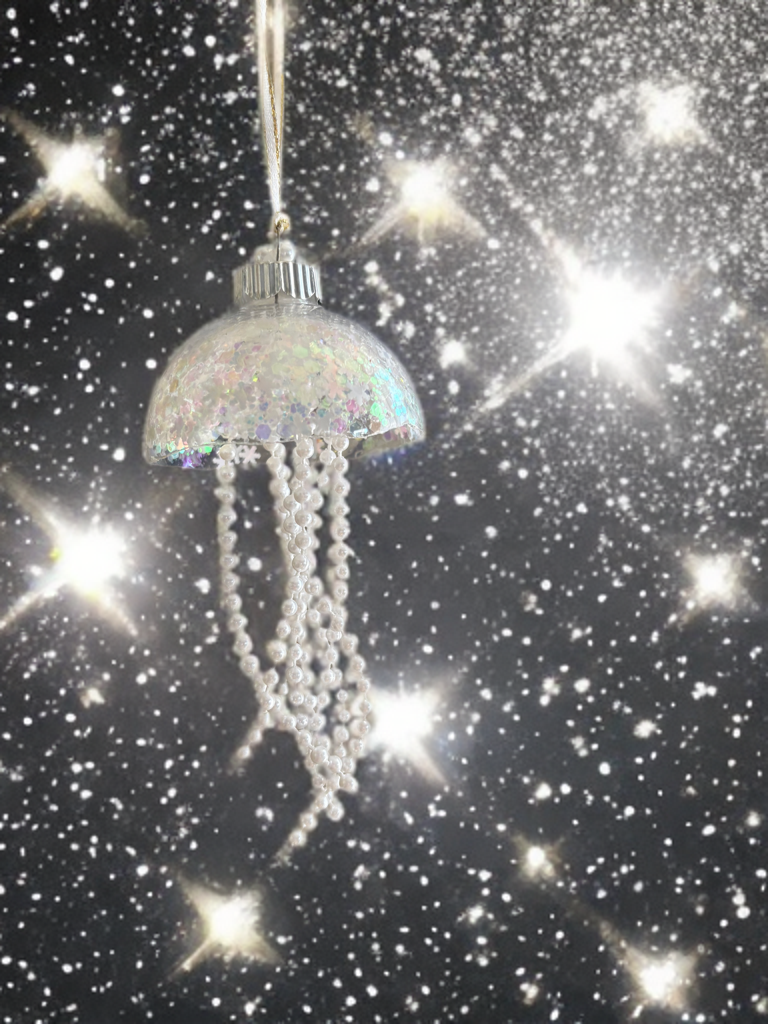 Unbreakable glittered jellyfish with miniature pearl strands produce a holiday ornament emanating true jellyfish.
