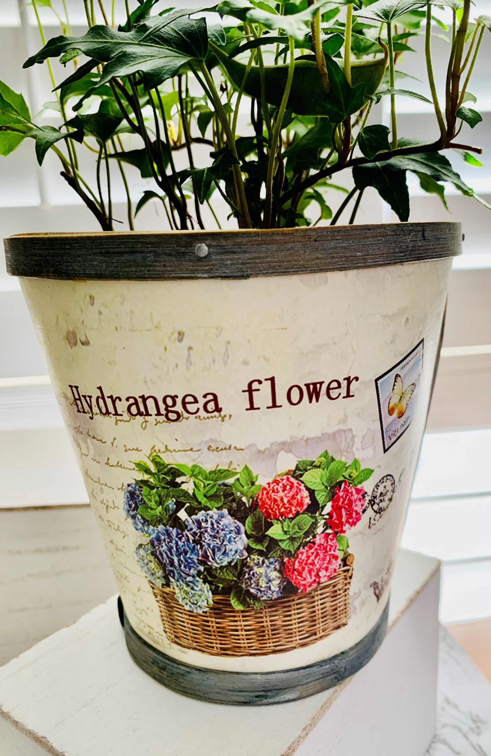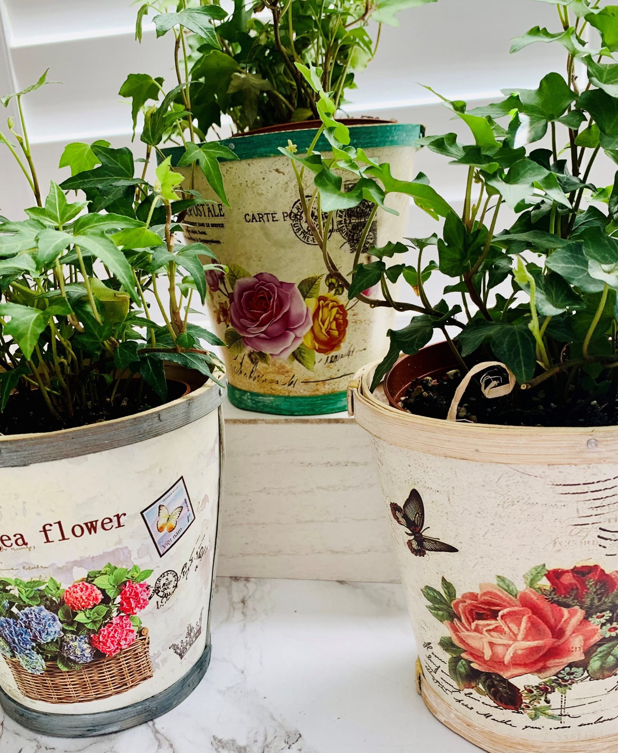 Three unique 5X5.5 inch balsa decorated planters for a patio centerpiece or windowsill accent. Lightweight and plastic-lined providing versatility used alone or as a group.