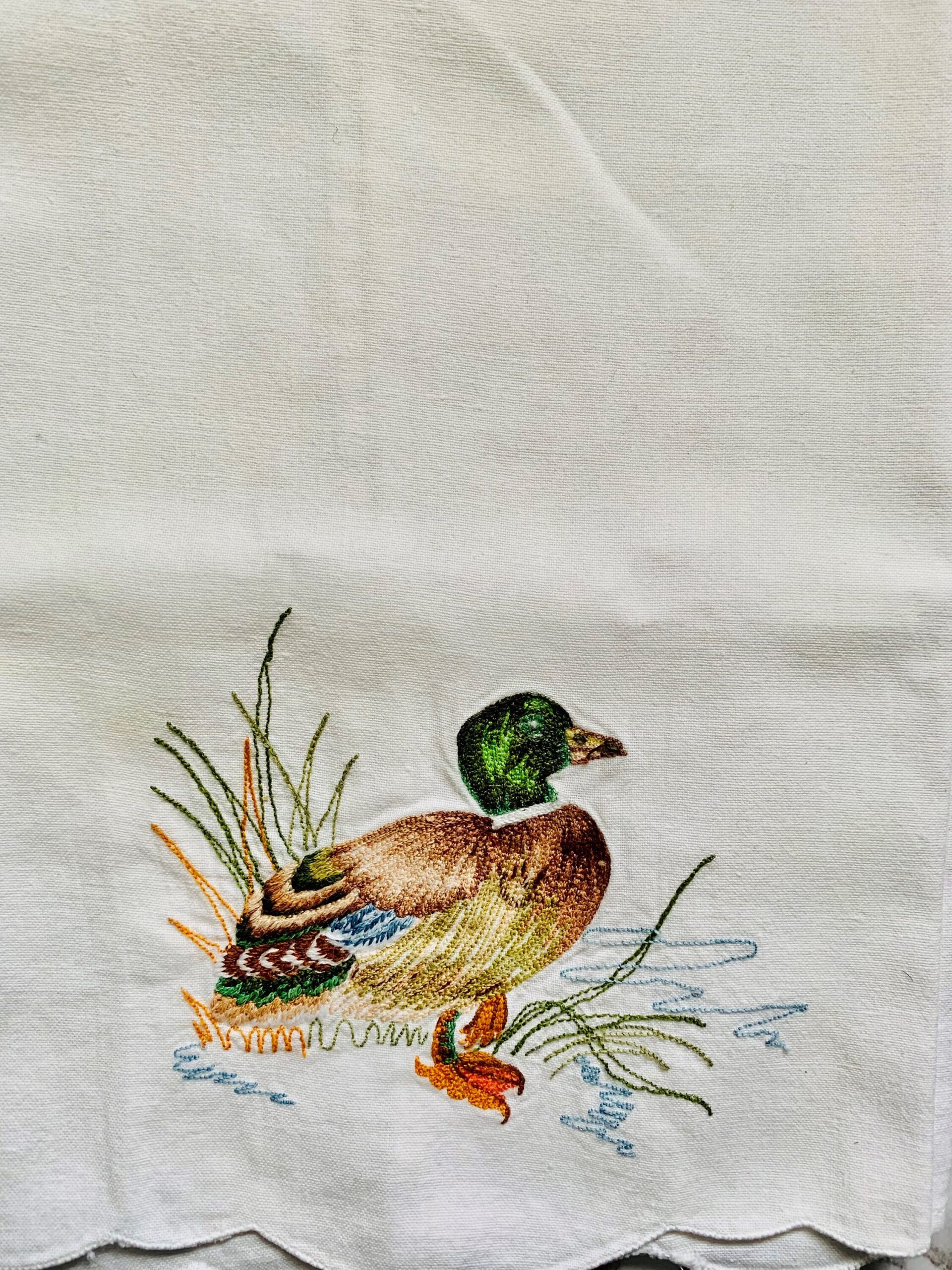 Machine embroidered cotton mallard duck and cardinal guest towels with scallop edging measuring 13X18 inches. Both are in vintage excellent condition.