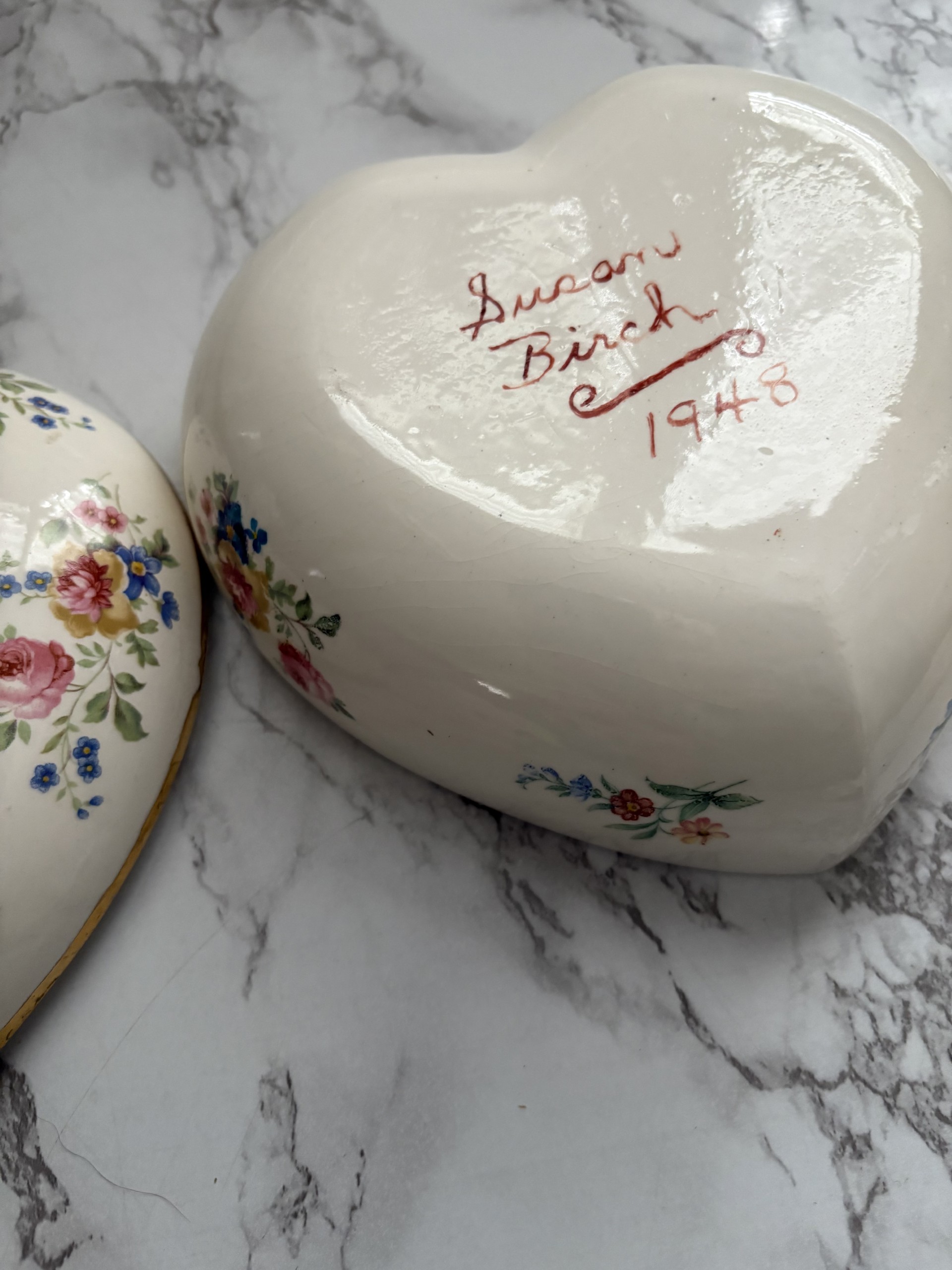 A 7X7X3 porcelain covered heart shaped bowl handmade in 1948. It’s in vintage excellent condition.