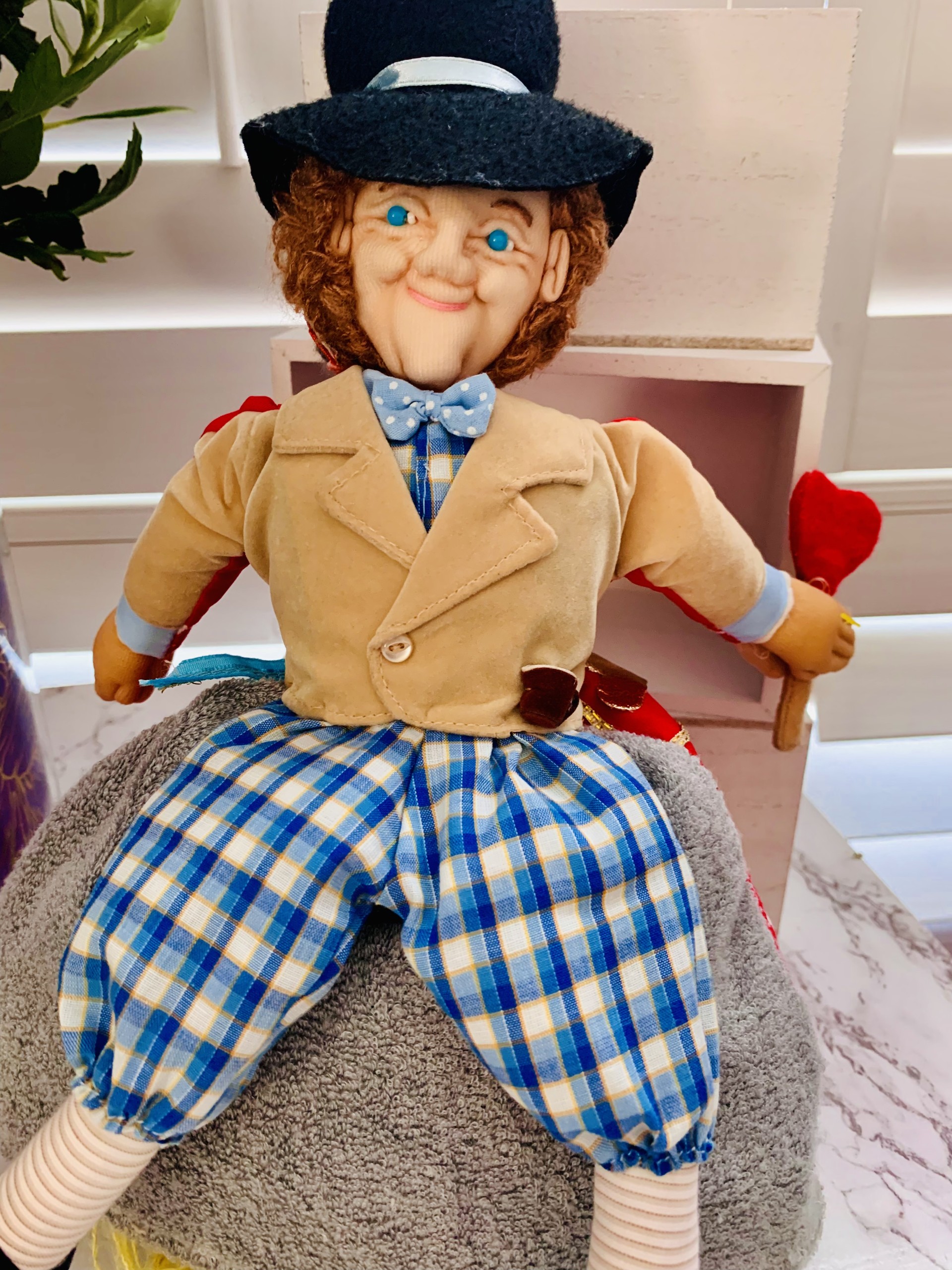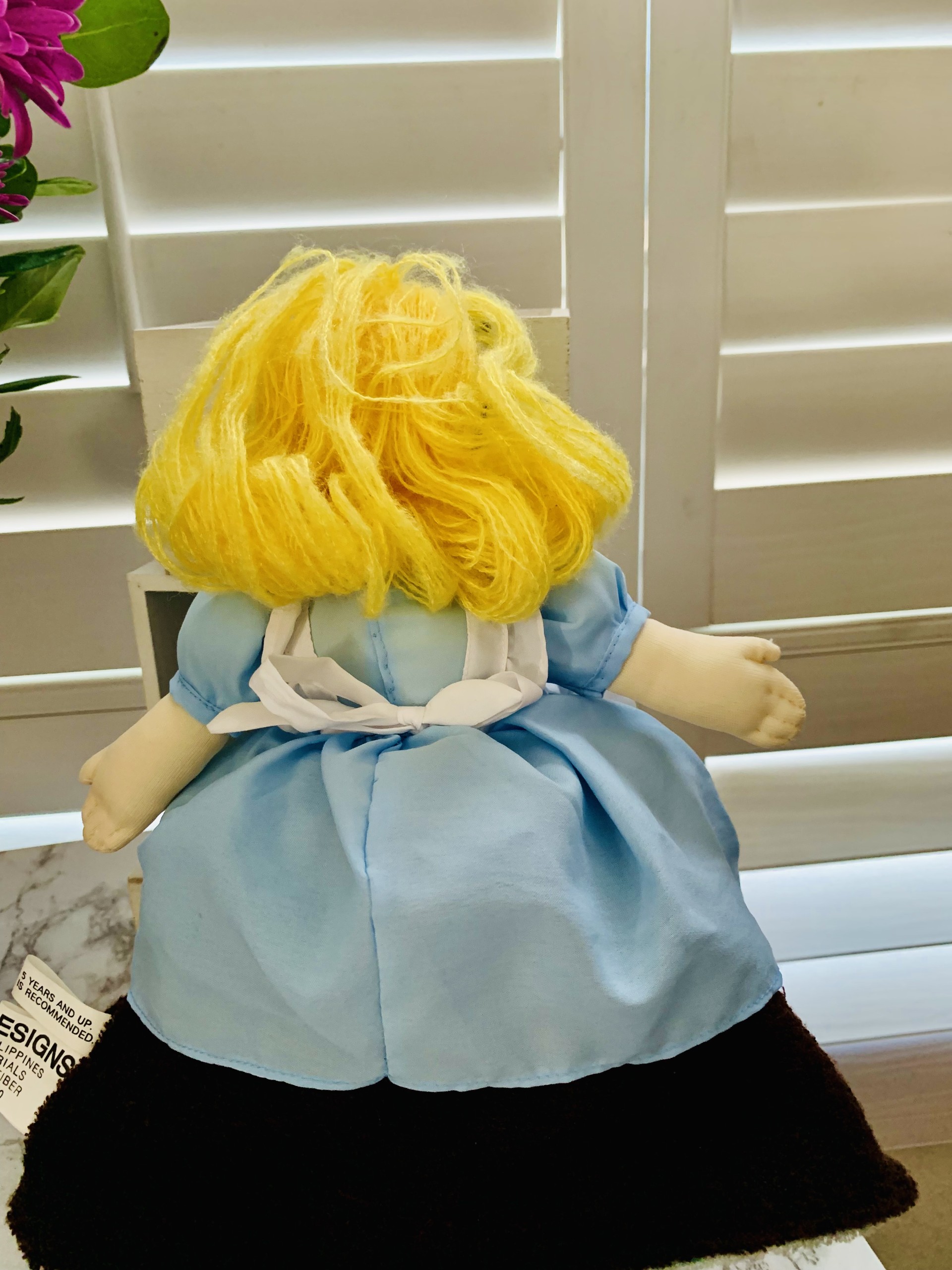 A soft body three-way doll from Alice in Wonderland, Alice, the Red Queen, and the Mad Hatter. You flip her as you tell a story. The doll is about 12 inches high. She’s in excellent condition, and she’s guaranteed to provide hours of imaginative play